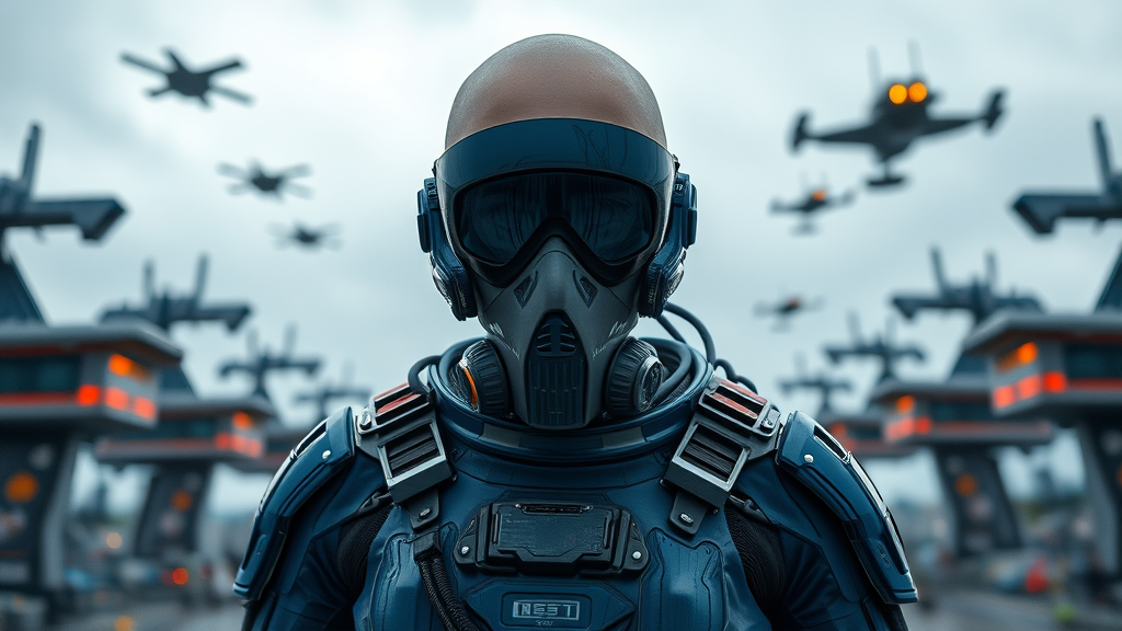 A formidable female figure in a futuristic blue sci-fi spacesuit stands confidently on a bustling spaceport. The backdrop features dynamic, flying platforms amidst an overcast sky. Her visage is obscured by a sleek sci-fi mask, complemented by advanced visors and a sophisticated respirator. Her bald head reflects the light, framed by intricate plate and isolated armor, exuding strength and protection. Captured from a third-person perspective from below, the scene is rich with fine details akin to a high-budget sci-fi movie, blending photography with cinematic flair. The setting is brought to life with natural textures, light, and a subtle blur that evokes a sense of realism. Enhanced through photorealism and cinematic rendering, the image benefits from ray tracing for unrivaled quality and detail. The moody and cinematic lighting adds depth, captured in 8K Ultra-HD resolution with long exposure, creating a breathtaking visual narrative.