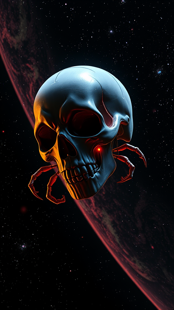 Imagine a hyper-realistic sci-fi scene in which a spaceship with the shape of a skull soars through the vast expanse of space. The black backdrop is studded with twinkling stars and swirling nebulae, adding depth and intrigue to the setting. The spacecraft showcases futuristic design elements with an emphasis on extreme detail, sharp focus, and cinematic flair. Employing advanced ray tracing techniques, the scene is rendered in stunning 16k Ultra High Definition with High Dynamic Range, ensuring breathtaking visual clarity. The unusual design includes cloned faces on the spacecraft, while its exterior features bizarre, mutated hands with extra fingers. The design maintains a sleek, sharp aesthetic, yet embraces an eerie and unconventional look. However, the focus remains on the spaceship and the vibrant space around it, free of any unwanted elements such as cropping, low resolution, or any form of text or trademark. The scene avoids distractions like cropped imagery, text artifacts, or any kind of signature or watermark, ensuring the viewer's attention is solely on the awe-inspiring skull-shaped vessel and its cosmic surroundings.