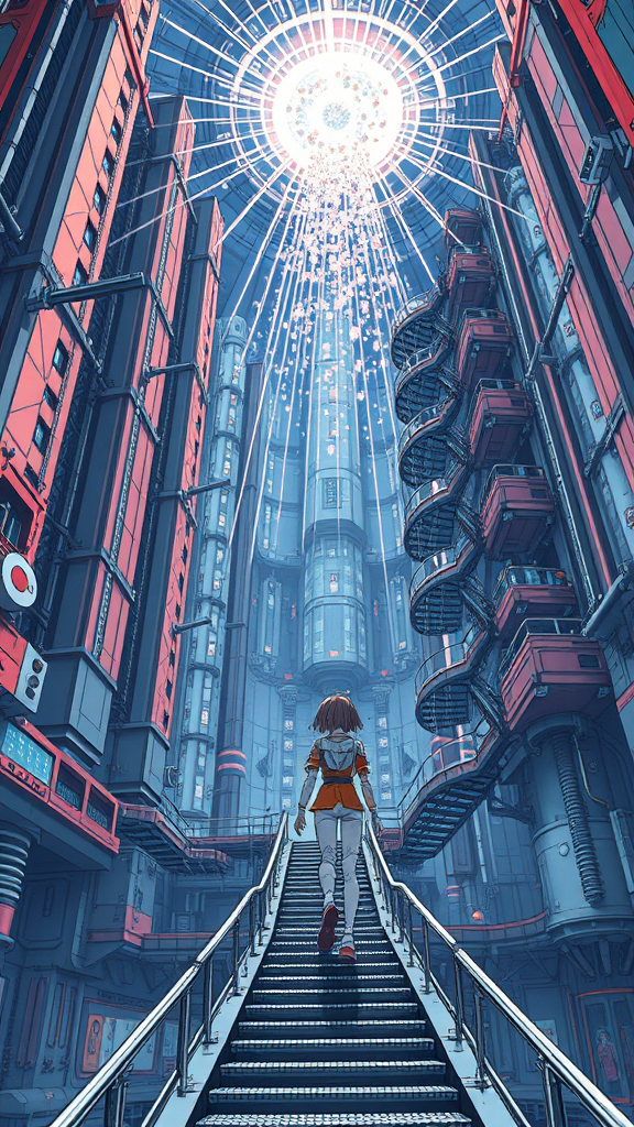 A young girl in an intricately designed spacesuit navigates the interior of a colossal spaceship, reminiscent of Tsutomu Nihei’s signature art style, akin to Sidonia no Kishi. The environment showcases elements of gigantism with towering structures and spiraling staircases extending through a multi-story space. At the heart of the scene, a monumental laser generator pulses with vibrant energy, casting beams from the sky. Clusters of luminous energy clot the atmosphere, creating a dynamic interplay of lights. The sense of acceleration and speed is palpable as bright flashes of light streak across the environment, embodying the futuristic, hyper-detailed aesthetics of sci-fi anime. The scene's depth and perspective give a first-person immersive experience, capturing the detailed manga graphics in ultra-high 8K HD super-resolution, blending the art of drawing with cutting-edge digital techniques.