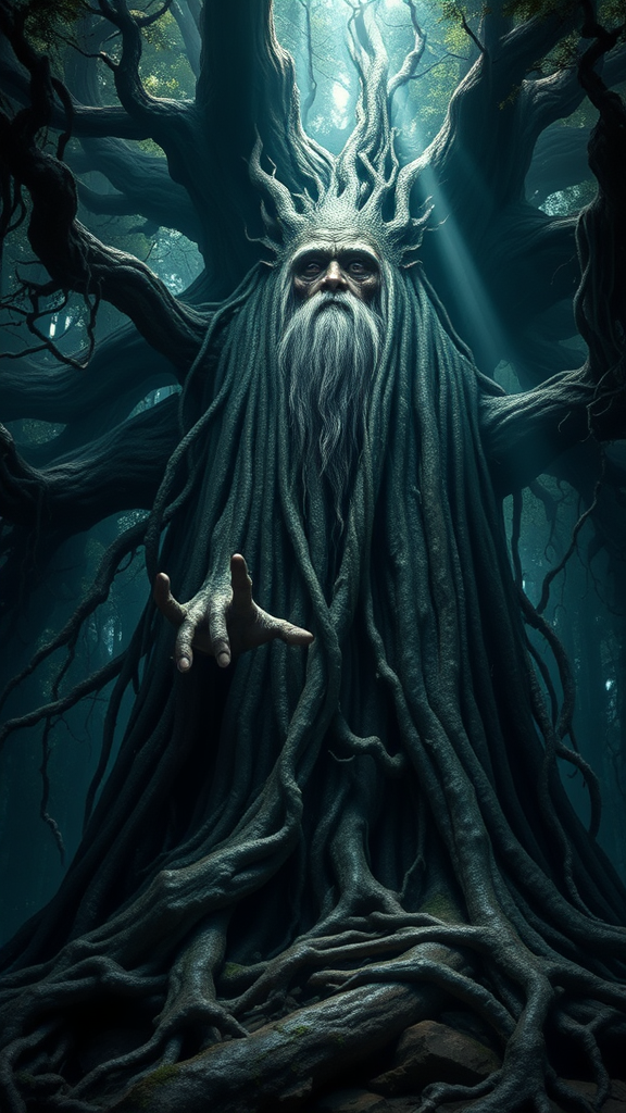 Treebeard standing majestically at the base of the tower of Orthanc, surrounded by ancient, sprawling roots and twisted branches. The scene is a detailed digital painting, hyper-realistic and fantasy-inspired, reminiscent of the works of Alan Lee and John Howe. The atmosphere is surreal, blending elements of nature and mythical lore, and is perfect for display on ArtStation. The image is captured with a highly detailed, sharp focus, and wide-angle perspective. There's a sci-fi edge that adds a dystopian beauty to the piece, with god rays piercing through a dense canopy, creating a cinematic lighting effect. The environment is dark and enigmatic, rendered in stunning 16k UHD HDR. Treebeard's eyes are deep and expressive, showing traces of age rather than deformity. His hands, although gnarled and root-like, are strong and precise. This breathtaking scene conveys a sense of timelessness and ancient wisdom, perfect for those who appreciate the mystical blend of nature and fantasy. The backdrop hints at epic tales and grand adventures, captured without any distractions like text or digital artifacts, ensuring the art remains pure and unblemished.