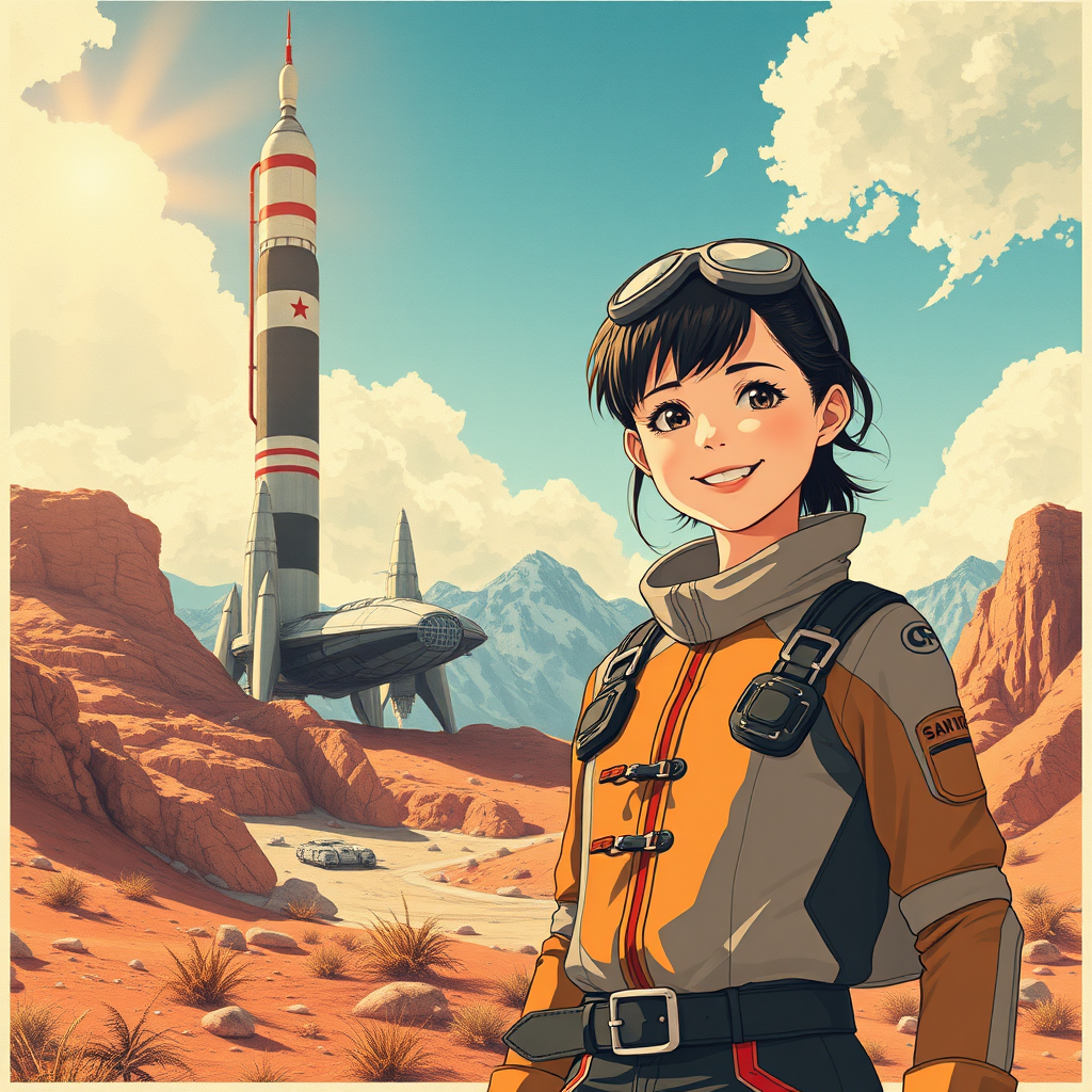 Young girl in futuristic sci-fi attire stands confidently against a backdrop reminiscent of a vintage Soviet-style poster. A towering rocket and spaceship imbue the scene with an adventurous spirit, set under a bright, sunny sky. The design captures the essence of anime and manga graphics, blending them with the nostalgic feel of offset printing. Rich, dark colors provide a striking contrast, enhanced by high detail and rendered in stunning 8K HD with vivid CMYK tones. The girl radiates happiness, bathed in natural lighting, evoking a sense of optimism and exploration.