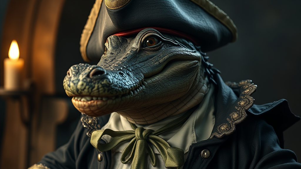 Realistic portrait of an anthropomorphic alligator dressed in elaborate 18th century pirate attire with a decorative neck tie, designed as a video game character, featuring intricate textures and detailing, captured with realistic cinematic lighting. The setting embraces a high-definition quality in 4K resolution, reminiscent of HBO's dramatic style, with a focus on dark and moody colors. Subtle creative touches include a weathered tricorn hat and a scar across one eye, adding depth and character to the alligator's rugged, adventurous demeanor.