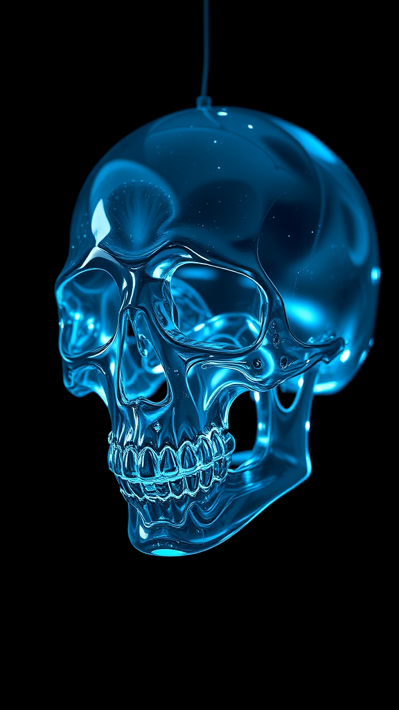 A hyper-realistic 3D image of a crystal-clear skull formed from polished glass, illuminated by ethereal cyan-blue light that flows through it, casting shimmering reflections and refracted beams. Suspended in darkness with a deep black backdrop, the composition exudes an enigmatic and futuristic aura. Rendered using the octane engine, the surface of the skull captures intricate details, with glimmers and highlights producing a mesmerizing interplay of light and shadow, enhancing its mysterious sci-fi allure.
