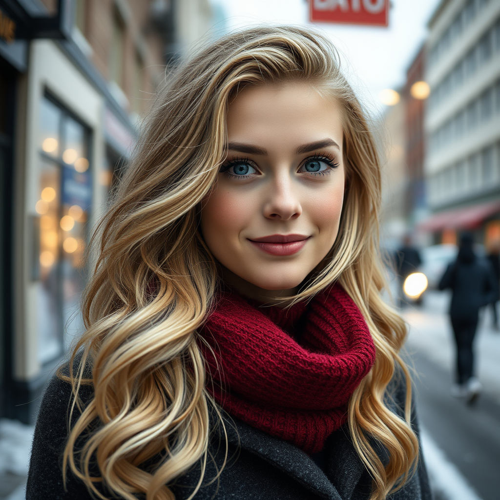 Professional portrait photograph of a stunning Norwegian girl in cozy winter clothing with flowing wavy blonde hair, playful expression, endearing freckles, perfectly symmetrical face, subtle natural makeup, posing outdoors on a snowy city street amid a chic modern urban setting, ultra-realistic, concept art, elegant, meticulously detailed, sharp focus, depth of field, shot with an 85mm lens at f/1.8, medium shot, centered composition, expertly color graded, soft, bright diffused lighting, gentle volumetric fog, trending on Instagram and Tumblr, HDR 4K, vibrant 8K quality without wide shot, cropped head, or any deformation.