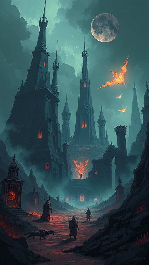 Epic fantasy illustration with a dark and atmospheric theme, featuring cartoonish yet realistic elements inspired by Diablo 4. Incorporate soothing tones with rich, deep colors to create a mood of mystery and adventure. The scene includes intricate details, showcasing an otherworldly landscape filled with ancient ruins and shadowy figures, ideal for a captivating wallpaper design.