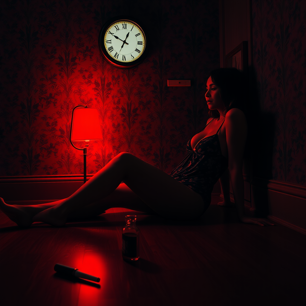 A moody, hyper-realistic, cinematic scene of a woman sitting on a polished wooden floor in a dimly lit room, exuding an air of calm and relaxation. She wears dark, floral-patterned lingerie and her posture is gently slouched as she leans back against the wall holding an empty glass bottle loosely in one hand. A small, vintage red lamp to her side casts a warm, gentle glow that creates dramatic shadows and accentuates her silhouette. The wallpaper behind her features a delicate floral motif, adding a layer of texture to the otherwise minimalist room. Above her, a vibrantly colored wall clock subtly hints at the passage of time. Nearby, the remnants of a burnt-out cigarette and an artfully placed lighter amplify the overall sense of melancholy and solitude. The subdued color palette is enriched by muted tones, with the red light and dynamic shadows providing striking contrast and depth. This scene captures a contemplative, fine art photograph evoking introspection and urban solitude, immortalizing a singular moment of quiet reflection.