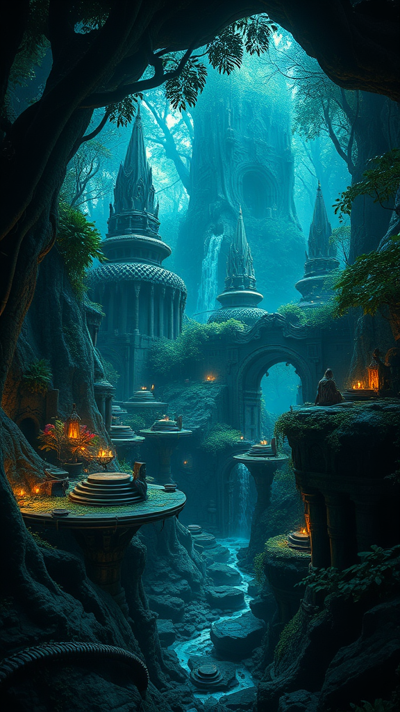 Phase-Space Enchanted Rainforest, Ancient Ruins, Hyperrealistic, Octane Rendering, Unreal Engine, Intricate Matte Painting, Fantasy Art Vision, 8k Resolution, DeviantArt Dark Fantasy Masterpiece --no Characters