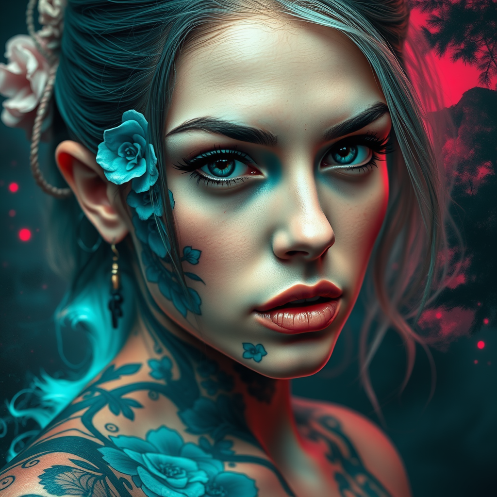A futuristic fantasy oil portrait of a tattoo artist with blue floral tattoos intricately woven into her skin, casting an intense gaze. The artwork features a blend of light red and teal hues, with elements of dark pink and light blue creating a dynamic contrast. The setting evokes a rococo-inspired photo shoot with a blend of digital manipulation, channeling the styles of Tanya Shatseva and Daniel F. Gerhartz. The composition is highly detailed, showcasing dark and explosive themes within a high-resolution, UHD image. The tattooed artist, with her unique skin artistry, commands attention in an imaginative, futuristic environment.