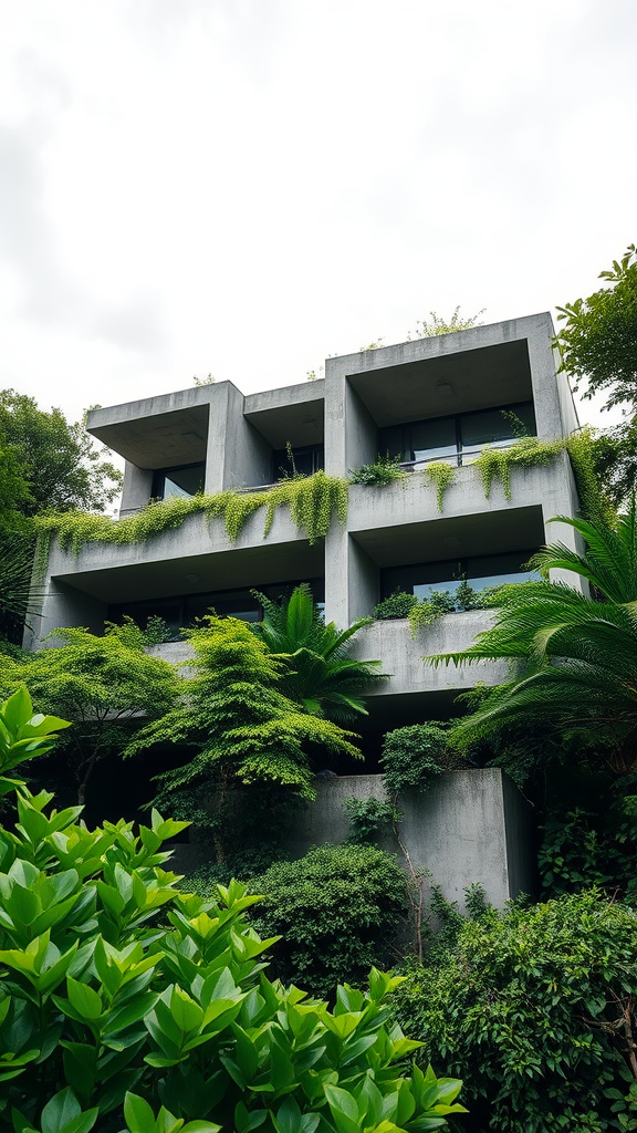 A contemporary, brutalist-style residential structure is nestled within vibrant foliage, featuring raw, exposed concrete with bold, rectangular, and cantilevered slabs. Each concrete element exhibits crisp, clean lines and varied depths, accentuating depth and form. Vegetation is seamlessly integrated into the design, with lush greenery cascading over the concrete edges, merging the natural with the stark, industrial aesthetic. Captured with a full-frame DSLR or mirrorless camera equipped with a wide-angle lens, the image encompasses the structure's full width and surrounding landscape, maintaining depth and scale. The lens is set to a small aperture, achieving a sharp focus on both the building and the foreground flora. The composition is meticulously balanced and symmetrical, with the building in the center, aligned horizontally. The structure occupies the middle of the image, while greenery fills the lower portion and a textured sky occupies the top, creating a harmonious, layered appearance. Overcast lighting provides gentle, diffused illumination, softening shadows and highlighting concrete texture while preserving a contemplative mood. Damp pavement in the foreground subtly reflects light, adding texture and anchoring the scene. A slight burst of sunlight filters through the clouds, casting an ephemeral glow on a section of the building.