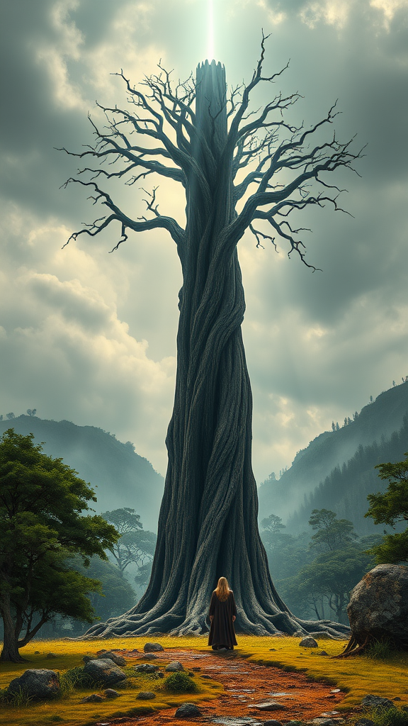 Treebeard stands solemnly at the base of the tower of Orthanc, bathed in the mysterious glow of god rays streaming from the overcast sky. This scene is a hyper-realistic digital painting, reminiscent of the works of Alan Lee and John Howe, captured in stunning 16k UHD resolution and cinematic HDR lighting. The scene is a surreal blend of fantasy and dystopian sci-fi, with sharp focus and a wide-angle perspective that captures the immense scale of the tower rising above. The landscape around is lush and ancient, yet hints at the dark, undercurrents of a world on the brink of change. There are subtle, creative alterations like the twisting branches of Treebeard's form, which echo the curvature of the tower, and his eyes appear wise and knowing, maintaining a sharp focus that cuts through the surrealism. The painting is notably devoid of artificial elements like text, watermarks, or signatures, ensuring the viewer's full immersion in the fantasy world.