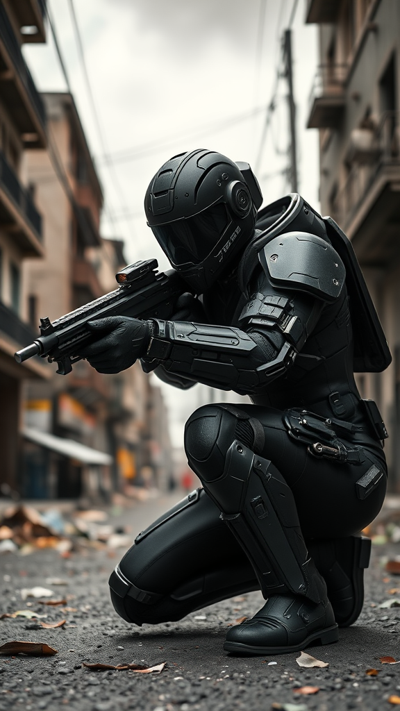 A black armed female figure in advanced sci-fi battle armor, crouched with cybernetic enhancements integrated into a sleek helmet. Her bald head is visible under a sophisticated sci-fi visor. She is in a focused pose, one knee down, aiming intently with a high-tech weapon gripped securely in her hand. The ensemble includes intricately designed plate and insulated armor, resembling a futuristic spacesuit adorned with numerous intricate details. This scene unfolds on a dilapidated city street under an overcast sky, offering a backdrop of chaos and decay. The setting is captured in a realistic, cinematic style, featuring natural textures and lighting that highlight the details with a soft blur. Photorealism is achieved through cinematic rendering and advanced ray tracing techniques, capturing a moment of tension and action. The perspective is third-person, with a moody lighting atmosphere that adds depth and intensity. This 8K Ultra-HD image utilizes dynamic and long exposure techniques to enhance the realism and drama of the scene.