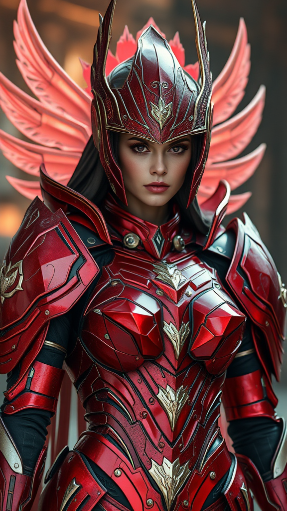 Goddess warrior knight in a sci-fi setting, adorned in beautiful futuristic space armor with a decadent and divine aura. Her celestial appearance is ultra-realistic, with battle-worn red armor that is intricately designed and elegantly crafted. The scene is cinematic, hyperrealistic, and highly detailed, capturing the essence of a legendary figure. Despite the detailed focus, there are technical imperfections visible: text errors, occasional missing or extra digits, cropped sections, jpeg artifacts, and unusual anatomy features. Some parts seem out of focus or mutated, giving the imagery an abstract, otherworldly touch. The imagery is marked with watermarks, adding a layer of mystery.