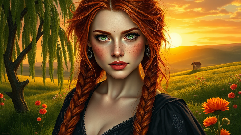 A captivating portrait of a character with a detailed face featuring sensual, messy ginger hair and freckles. Strong, square jaw with long, intricate braids frame high cheekbones and sharp features. Heart-shaped lips complement her striking green eyes, all set against a dynamic golden hour backdrop. She wears a long, elegant, sensual dark dress that accentuates her hourglass figure and a substantial chest. The setting is a beautiful, hyper-detailed landscape with weeping willows, green grass, and vibrant flowers, resembling earth art with a fantasy twist. The scene is painted with intricate elegance and high detail in an oil painting style reminiscent of Artgerm, Greg Rutkowski, Alphonse Mucha, and William-Adolphe Bouguereau. Reflections and octane render bring photorealistic, hyper-realism quality to the scene with sharp focus. The composition offers a zoomed-out, full-body view of the character, echoing the enchanting allure and adventurous spirit of a "Lord of the Rings" character. Presented in UHD, HDR, 8K quality, the artwork captures the essence of fantasy with artistic mastery, avoiding any imperfections or distractions.