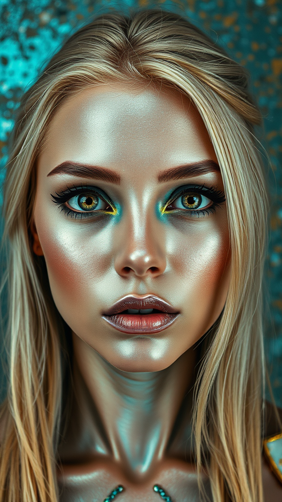 A striking front-facing portrait of a blonde woman with piercing brown eyes and metallic skin, seamlessly merging into a textured, patinated backdrop. Intricate details are highlighted with significant metallic makeup. The color palette features hues of blue, green, beige, and neon accents, creating a captivating contrast. The style captures raw essence and vivid details, presenting a harmonious blend of the woman's features with the abstract background.