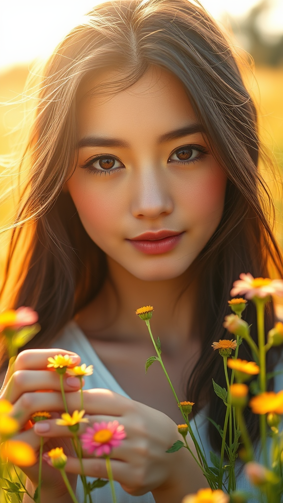 A close up portrait of a beautiful woman with delicate features, gracefully picking vibrant wildflowers in a sunlit meadow, inspired by the art style of Ken Sugimori. The scene captures the serene atmosphere of a summer dawn, with soft light illuminating her gentle expression. Her flowing hair gently cascades over her shoulders, and her attire blends harmoniously with the natural surroundings, enhancing the tranquil ambiance. The focus is on her genuine connection with nature, creating a peaceful and enchanting moment without any extraneous elements or distortions to the image, ensuring an immaculate and unblemished portrayal of beauty in its purest form.