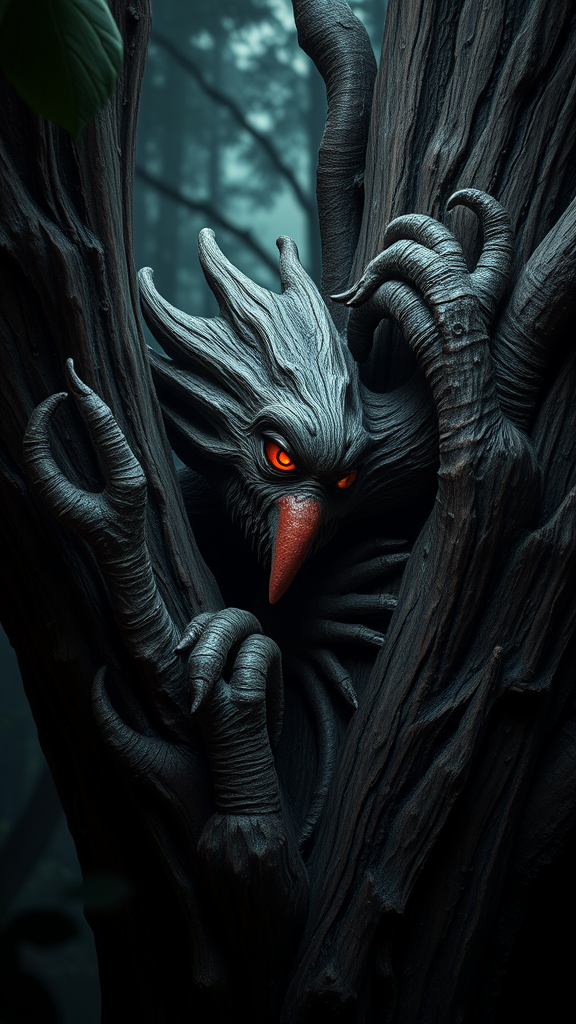 a menacing wood creature with a piercing red eye emerges from the depths of a shadowy forest, drawing inspiration from filip hodas and daz3d, reminiscent of sandy skoglund's surreal touch and natalia rak's vibrant palette. the creature boasts hyper-realistic details, a testament to anthropological intricacy, set against a mysterious jungle backdrop. akin to zbrush artistry, its surface resembles colorful woodcarvings, blending frogcore whimsy with lovecraftian mystique. perched within a gnarled tree, a sinister figure with a striking red nose peers from the bark, evoking characterful animal portraits. each element is meticulously rendered in hyper-detailed 32k uhd, capturing the scene as a true masterpiece of unsettling wonder