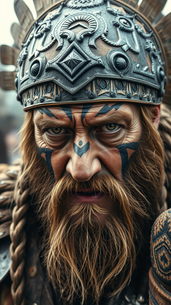 A formidable Viking warrior with a wrinkled yet dignified face, piercing bright brown eyes, flawless gaze, and timeworn skin, adorned with intricate war paint and a majestic war bonnet, returning home after battle. Rendered in ultra-realistic 8k detail, capturing every nuance of emotion and strength, with a touch of artistic depth and atmosphere.