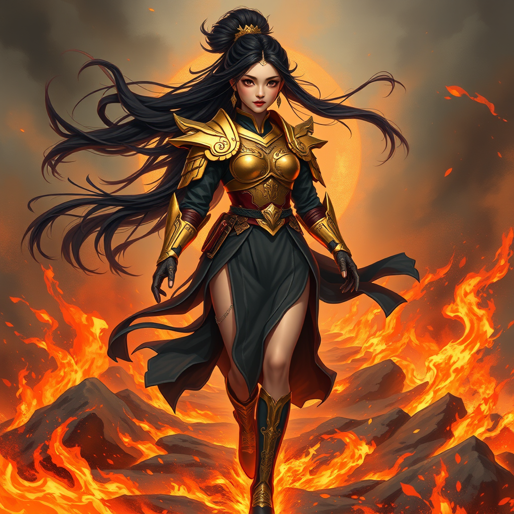 A young woman with flowing dark hair and shimmering golden armor strides confidently across a path of flames, embodying a fusion of Tristan Eaton's dynamic compositions and the elegance of traditional Chinese brushwork. Her expression is fierce yet calm, as if the fire cannot touch her spirit. Infused with a playful energy reminiscent of Skottie Young, her presence is both bold and graceful, capturing a moment of strength amidst chaos. The scene echoes the emotive realism of Michael Malm, while the vibrant details bring to life an otherworldly realm akin to UE5's immersive worlds, richly contrasted and evocative.