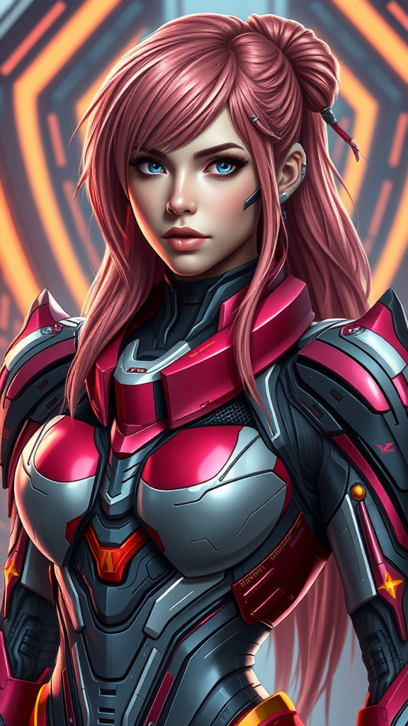 Photorealistic stunning portrait of Asuka Langley in futuristic sci-fi armor, intricate details, vibrant colors, emphasizing her determined expression and dynamic pose, futuristic background elements, sleek design, capturing a sense of strength and elegance.