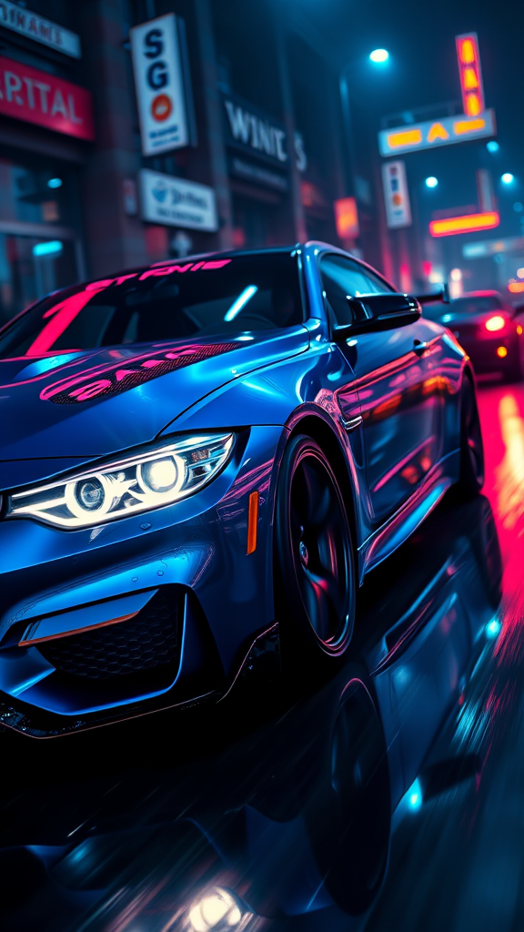 Sport car shimmery metallic blue paint job aggressive look custom tuned BMW and Corvette blend full car in motion high speed movie action scene wet road underground illegal racing vibrant neon lights moody dark atmosphere bright headlights cyberpunk Blade Runner vibes cinematic concept art full view sports car highly detailed digital art ArtStation style masterpiece photorealistic sharp focus 8k HDR shallow depth of field broad lighting high contrast backlighting bloom light sparkles chromatic aberration RAW color photo intriguing futuristic design dynamic environment smooth curves and edges single car headlights blazing through the night.