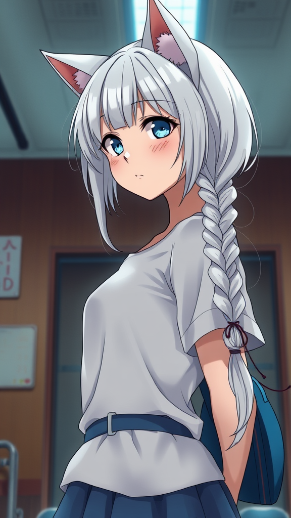Solo anime girl full body young adult body medium chest school background hyper-detailed medium white hair braid cat ears beautiful detailed blue eyes side view from waist thick line art anxious natural light with reflective light volumetric lighting maximalist photo illustration high resolution intricate complex key visual precise line art vibrant panoramic cinematic masterfully crafted ultra detailed expressive hypermaximalist colorful rich deep color vintage show promotional glamour anime art fantasy art brush strokes UHD HDR aspirational style atmospheric 4k ultra-cinematic sharp focus hyperrealistic depth of field masterpiece colors 3d render concept art trending high detail dramatic photorealistic painting vivid model shoot professional majestic oil painting inspiration intricately crafted anime style with modern digital art influenced by Studio Ghibli Jeremy Mann Greg Manchess and Antonio Moro trending on art communities like ArtStation and CGSociety.