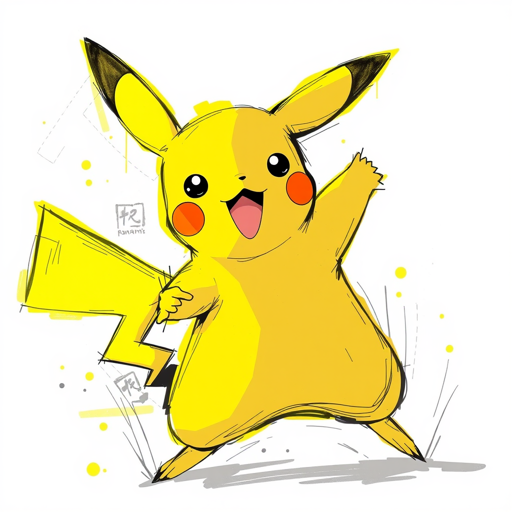 Pikachu in a dynamic action pose, capturing the essence of anime with an expressive sketch style, infused with nvinkpunk aesthetics. The artwork features abstract brush strokes and bold, heavy lines, with an HDR Neo-Noir influence. Bright neon yellow illuminates Pikachu, forming a minimal yet impactful visual narrative.
