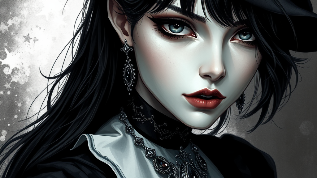 A striking close-up portrait of a woman in a black and white ensemble, exuding the aura of a fashionable dark witch. Her piercing gaze is intensified by intricate details, reminiscent of WLOP's and Loish's art styles. Elements of gothic horror permeate the image, blending seamlessly with the elegance of Guweiz’s influence. Her textured raven hair cascades over her shoulders, contrasting with her delicate, pale complexion. Intricate jewelry adorns her neck, adding a touch of opulence to her mysterious presence. The background is a shadowy blend, enhancing the otherworldly and enigmatic aura of this goth girl character.