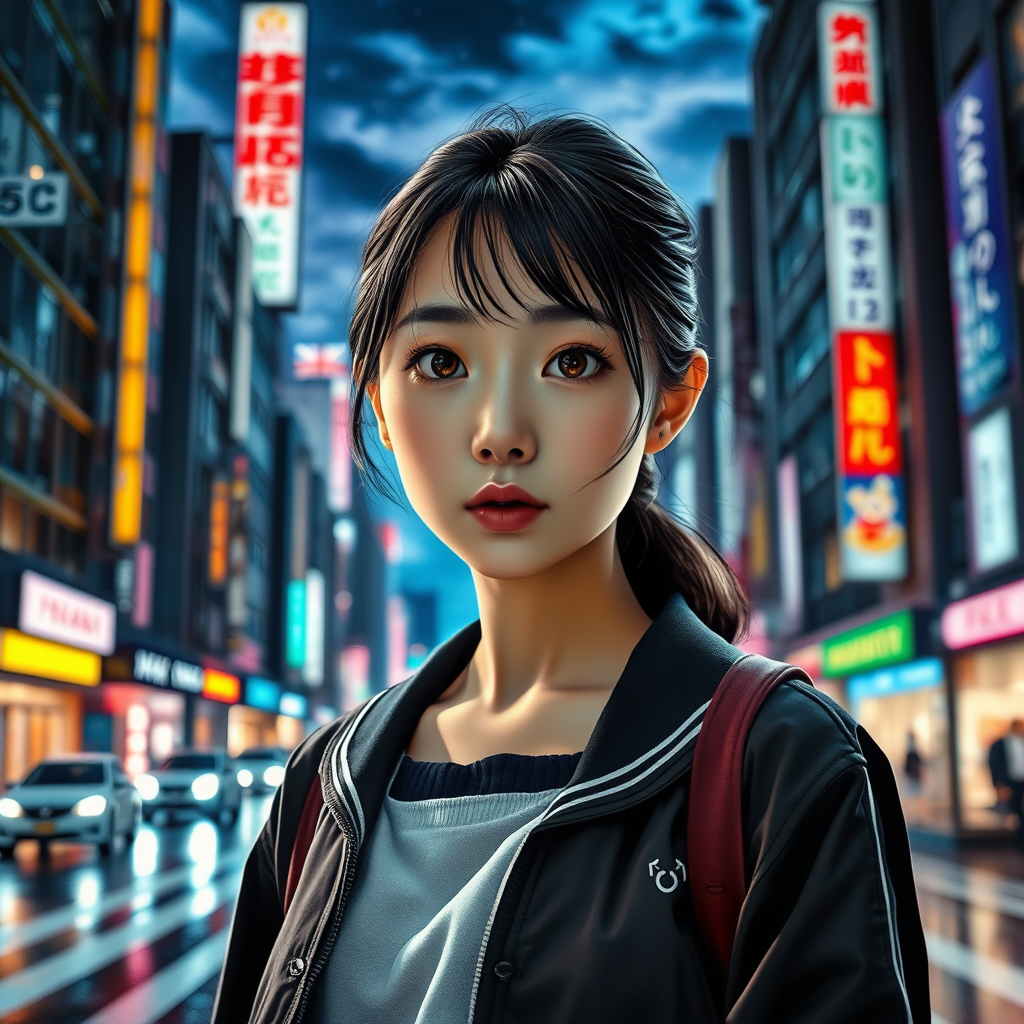 A beautiful girl stands alone on a bustling Tokyo street at night. The vivid details of the cityscape create a stunning backdrop, with bright lights reflecting off the rain-slicked pavement. The sky is painted with deep blues and purples, twinkling stars visible between the clouds. Her face is illuminated by cinematic lighting, highlighting her strikingly detailed eyes and perfect lips. She's wearing a short jacket over a classic school uniform, her style slightly edgy yet timeless. Her eyes gaze directly at the viewer, filled with emotion and depth. The professional use of lighting, including photon mapping and radiosity, adds realism, giving her a lifelike and captivating presence. The scene captures her full body in a fluid, poised stance, creating a dynamic and immersive visual narrative. The artistry is free from any blemishes or imperfections, ensuring a focus on her natural beauty and the vibrant urban environment around her.