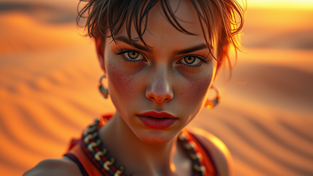 Portrait art of a dune scene, 8K ultra-realistic detail, where lens flare and atmosphere create a glowing ambiance. The composition is vivid, with intricate detailing and full of color. It features cinematic lighting, making it stand out as a trending piece on ArtStation. Rendered in 4K resolution, it's hyperrealistic with an extreme focus on the details using Unreal Engine 5. The composition has cinematic qualities, as a true masterpiece, enhanced by lumen reflections. The stunning environment captures hyperrealism in CGI, achieved through 3D design. Despite featuring complex elements, it plays with distorted anatomy—fuzzy and blurry features like extra arms or fingers for an avant-garde twist. The artistry is intentional, with poorly drawn hands, slight disfigurements, and charmingly deformed or mutated aspects, exploring unique tiling techniques for an unexpected narrative.