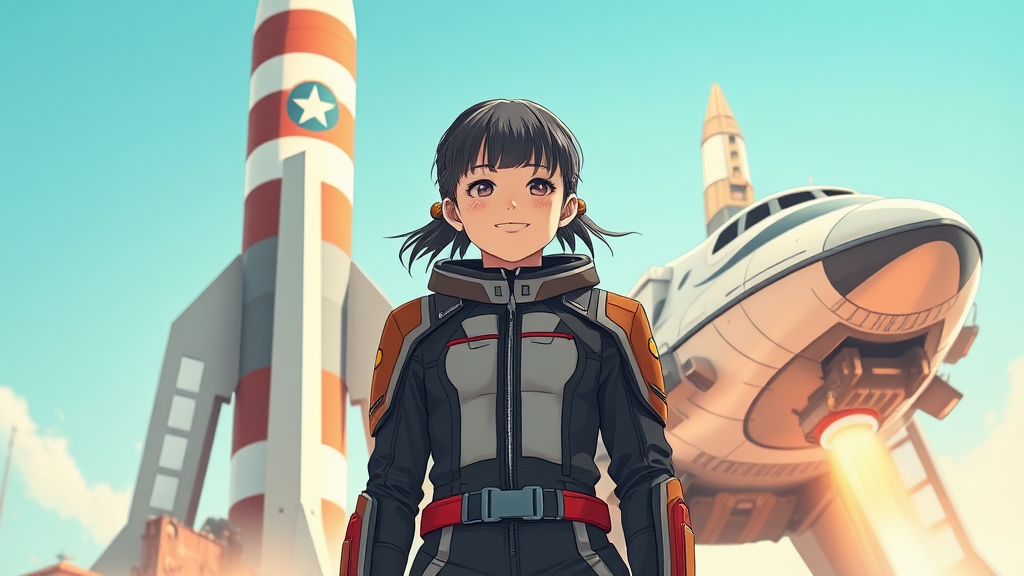 A young girl wearing a futuristic sci-fi suit stands confidently in front of a towering, vintage-style rocket and sleek spaceship, embodying the spirit of a Soviet-era poster with a nostalgic USSR aesthetic. The scene is set under a bright, clear sky, capturing a blend of anime and manga art styles with dark, bold colors and intricate details. The design exudes the charm of offset printing with high precision, depicted in 8K resolution and vibrant CMYK colors. The girl’s expression is joyful, bathed in natural lighting, embodying both optimism and adventure.