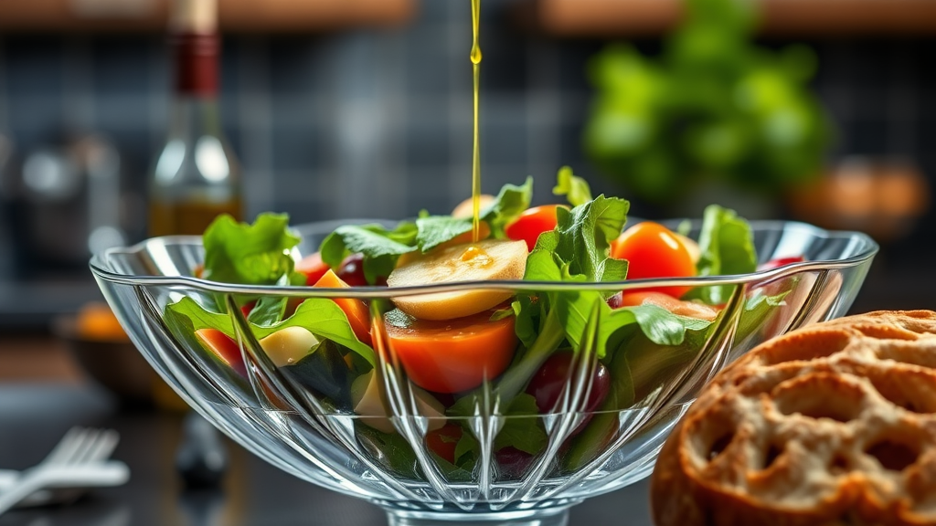 Luxurious Michelin-inspired food photography featuring a vibrant vegetable salad in an elegant crystal bowl, drizzled with rich olive oil, accompanied by artisanal bread, captured in a refined kitchen setting. Studio lighting enhances the exquisite depth of field, showcasing ultra-detailed textures. The uplighting highlights the salad's natural features, with a close-up perspective emphasizing its fresh and colorful appeal.