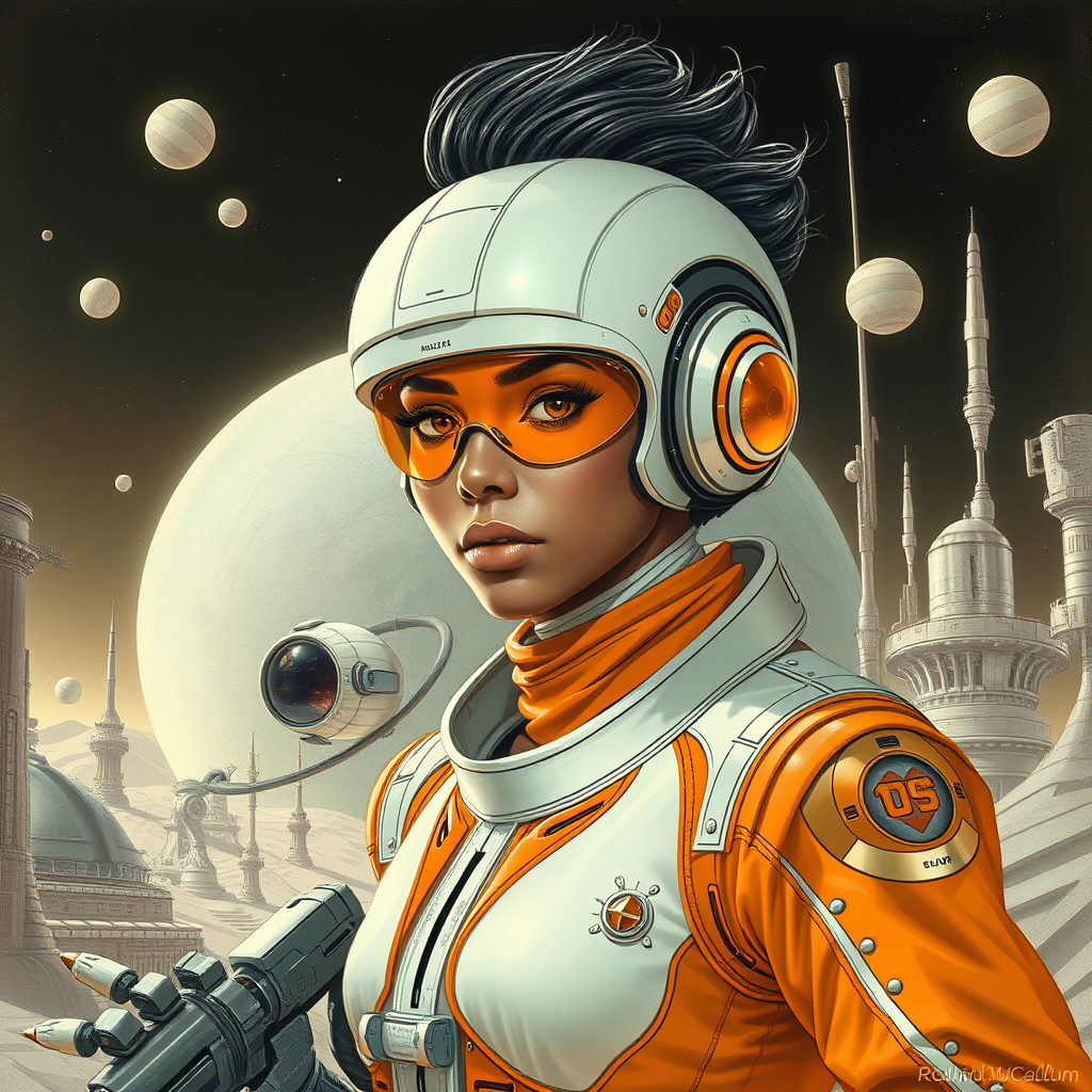 A futuristic character design by Roblunda McCallum, embodying a blink-and-you-miss-it level of detail within a dynamic full-body portrait. The palette is dominated by contrasting shades of dark white and light orange, melding classic sci-fi realism with the nostalgic flair of pulp comics. The scene captures the essence of airbrush artistry, blending seamlessly with the vivid exaggerations typical of comic art. The intricate environment is filled with subtle technological marvels, hinting at a vast universe while remaining rooted in the dramatic, stylized depictions of retro-futuristic adventures.