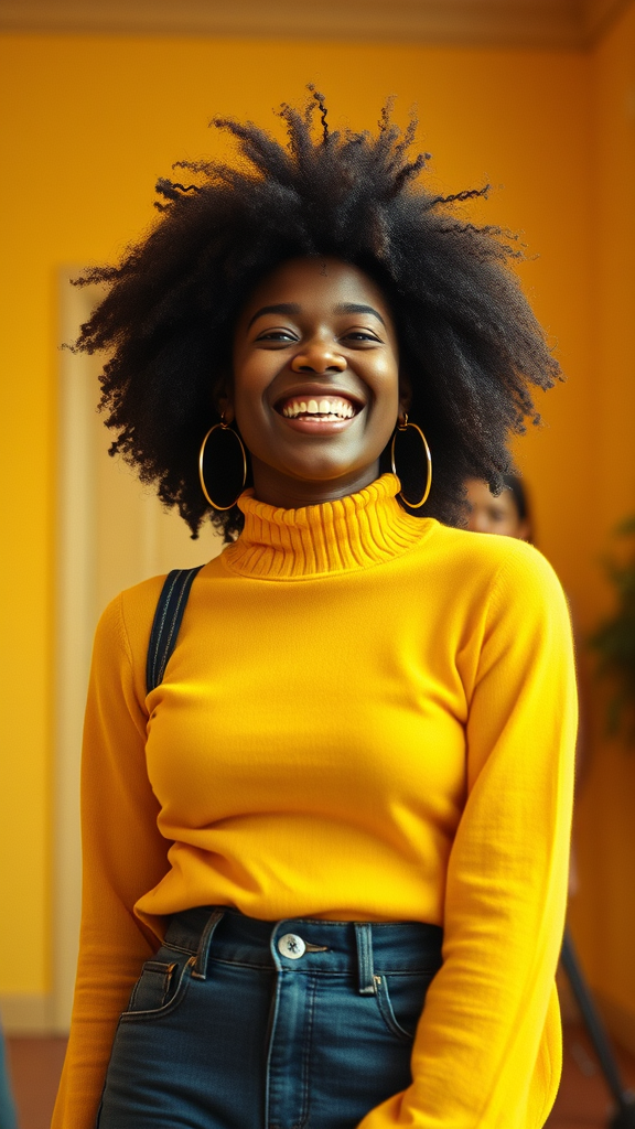 A joyful young woman with deep skin tone and a vibrant afro hairstyle wears a bright yellow turtleneck sweater, embodying the lively spirit of 1970s hip-hop culture. Her large hoop earrings add a bold touch, complementing her flared bell-bottom pants. The scene is captured in cinematic lighting with high-frequency details, reminiscent of a 35mm film aesthetic. Film grain from Kodak Proimage 100 enhances the nostalgic feel, while a shallow depth of field introduces a soft bokeh effect, creating a masterpiece of vintage allure with a modern twist. Subtle cyan accents give the image a unique pop, enriching the yellow tones and overall composition.