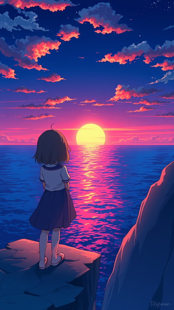 Anime scene of an adorable girl gazing at a breathtaking sunset over the vast ocean, perched on the edge of a cliff, surrounded by gentle sea breezes and vivid colors reflecting on the water's surface.