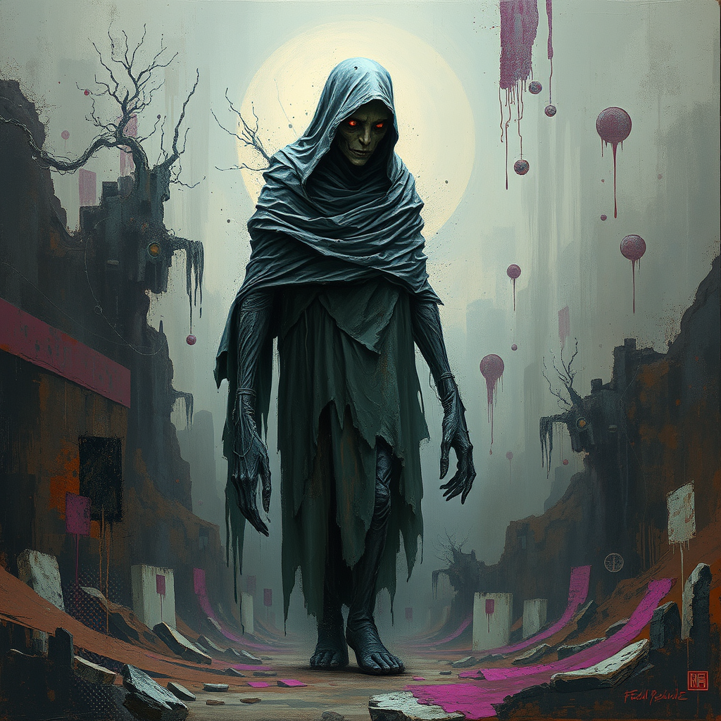 A haunting full-length figure cloaked in futuristic tattered garments emerges from the surreal landscape, its ghostly cold eyes piercing through with terrifyingly dark pupils. The mixed media artwork combines layers of paint, texture, and digital manipulation to render the figure in an evocative palette of shadowy grays, muted purples, and sickly greens, casting an eerie glow upon its form. Surrealist contours twist and blend with expressionist strokes, imbuing the figure with an unsettling presence. The creature's elongated limbs and distorted features meld into the chaotic backdrop, where abstract patterns suggest murmurings of a dystopian future. Enhancements such as ethereal wisps and subtle metallic sheens spark hints of otherworldly technology, merging with the primal to create a disquieting tension. Fractured elements throughout the piece reflect both an internal struggle and a fragmented world, drawing the viewer into its nightmarish, enthralling narrative.