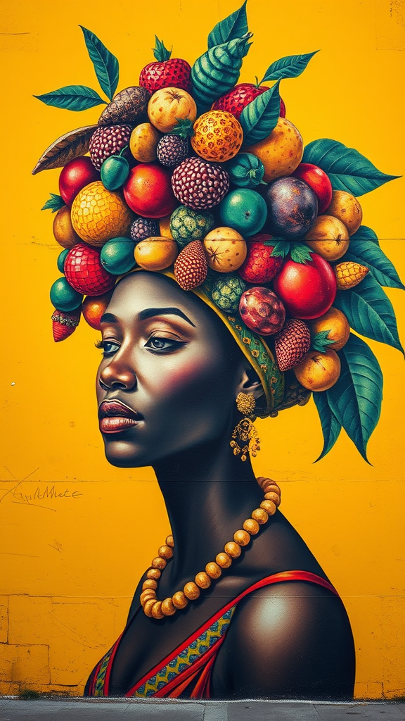 A vibrant mural of a woman adorned with a headdress of colorful fruit, set against a vivid yellow wall. The composition blends the intricate, textured style of Ingrid Baars with elements of Benin art, showcasing a harmonious fusion of cultures reminiscent of melting pots. The scene embodies the grandeur and lavish detailing of Paolo Veronese's work, with a focus on chiaroscuro techniques to create depth and contrast in the portraiture. The artwork's elongated aspect emphasizes the elegance and grace of the subject, inviting viewers to explore the layers of cultural and artistic influences intertwined within the piece.