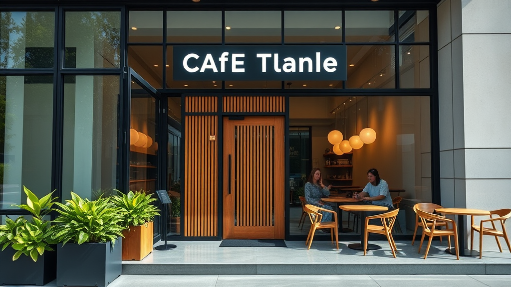 A sleek and inviting modern cafe facade featuring expansive floor-to-ceiling glass windows framed with matte black aluminum, allowing natural light to flood the interior. The entrance boasts a custom-designed wooden door with vertical slats, offering a warm contrast to the minimalist design. Above the door, illuminated sans-serif signage in soft white LED lights spells out the cafe's name, creating an elegant focal point. Planters with lush green foliage line the entrance, introducing a pop of color and welcoming patrons with a touch of nature. Gleaming concrete steps lead to the door, embodying the cafe's clean aesthetic, while minimalist outdoor seating with Scandinavian-inspired wooden chairs and tables is arranged neatly along the sidewalk, inviting passersby to pause and enjoy.