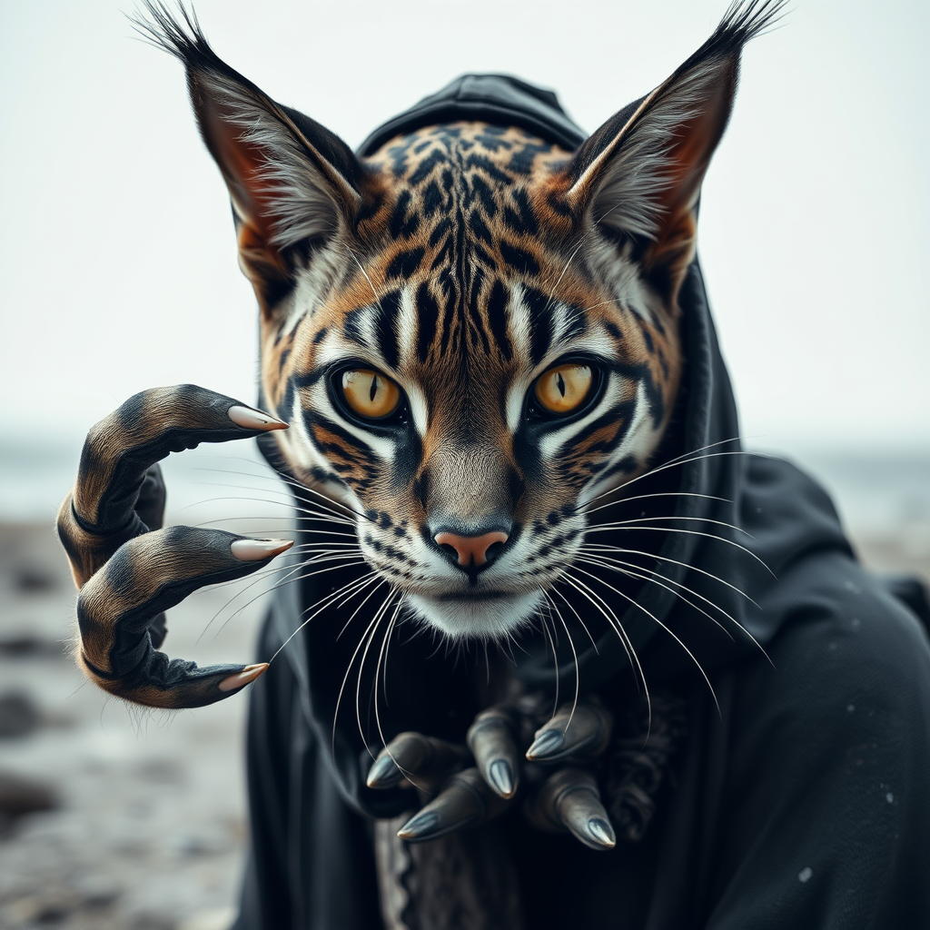 Full-length portrait close-up photograph, detailed feline facial features, playfully engaging with the camera, head, male humanoid form, wearing obsidian druid robes, in an outdoor setting, dramatic cinematic lighting, vibrant and intense, dynamic stance, fur trimmings, intricate and life-like appearance, intentionally flawed artistry with a monochrome palette, plain minimalist background, random background noise, distorted proportions, unusual fused fingers, hood, cap, multiple ears, cold color tones.