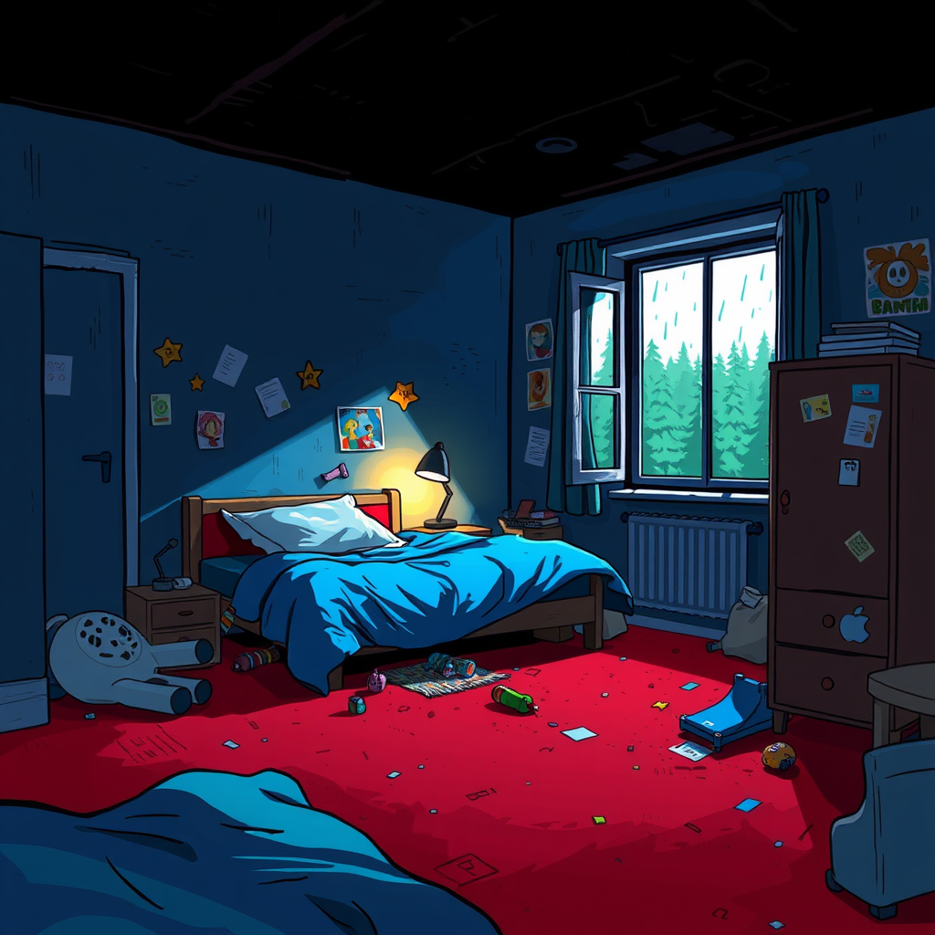 A digital cartoon art style depiction of a dimly lit bedroom featuring red carpeting and faded blue walls with a contrasting black ceiling. The bed, tucked into the corner of the room, is adorned with a vibrant blue duvet, and a window beside the bed reveals a rainy day with lush, green forests in the distance. The room is cluttered, with toys scattered haphazardly and a wardrobe ajar next to the bed. A gentle glow emanates from a small lamp on a bedside table, casting playful shadows that amplify the room's messy charm, while colorful stickers and drawings adorn the walls, adding a whimsical touch to the otherwise somber setting.
