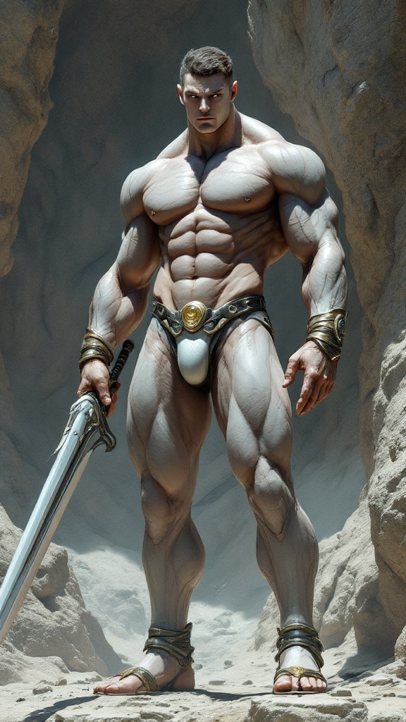 Sci-Fi futuristic fantasy, legend, homo-erotica. On an Alien world, handsome giants known as Brutons emerged from the rock formations. They look like living statues with their marble-like skin and gemstone colored eyes. Ruggedly handsome, masculine, beautiful men. They stand at 7feet tall or taller, and their bodies are physical perfection with broad chests and backs, narrow waists, muscular sinewy bodies, strong massive arms, powerful legs. Their bodies are sculpted to perfection by nature, and they wear very little clothing other than iridescent diaphanous white thongs on their girthy genitals and metallic sandals with straps up to the calves. There may be metallic bands around the tops of their biceps, and metallic bracers on their arms. They all wear metallic circlets around their foreheads, their hair is short and sculpted, usually a wavy fade hairstyle of any color. They help build the futuristic city as well as guard it, carrying huge shining swords or fighting with their own massive muscles. When they are not standing at attention, they keep company with each other, laying together and absorbing sunlight. They do not sweat, but their bodies glisten and sparkle from the microcrystals inside their bodies. They do not speak, but share a telepathic bond with one another. They are an all-male race, looking only to each other for pleasure when not building or gaurding. The other aliens on their planet appreciate and love them very much for all they do. {{{MASTERPIECE}}}