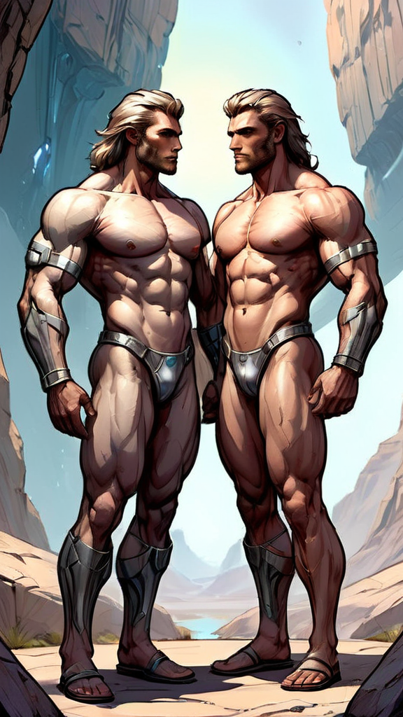 Sci-Fi futuristic fantasy, legend, homo-erotica. On an Alien world, handsome giants known as Brutons emerged from the rock formations. They look like living statues with their marble-like skin and gemstone colored eyes. Ruggedly handsome, masculine, beautiful men. They stand at 7feet tall or taller, and their bodies are physical perfection with broad chests and backs, narrow waists, muscular sinewy bodies, strong massive arms, powerful legs. Their bodies are sculpted to perfection by nature, and they wear very little clothing other than iridescent diaphanous white thongs on their girthy genitals and metallic sandals with straps up to the calves. There may be metallic bands around the tops of their biceps, and metallic bracers on their arms. They all wear metallic circlets around their foreheads, their hair is short and sculpted, usually a wavy fade hairstyle of any color. They help build the futuristic city as well as guard it, carrying huge shining swords or fighting with their own massive muscles. When they are not standing at attention, they keep company with each other, laying together and absorbing sunlight. They do not sweat, but their bodies glisten and sparkle from the microcrystals inside their bodies. They do not speak, but share a telepathic bond with one another. They are an all-male race, looking only to each other for pleasure when not building or gaurding. The other aliens on their planet appreciate and love them very much for all they do. {{{MASTERPIECE}}}