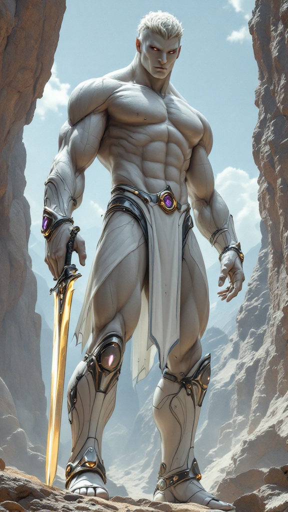 Sci-Fi futuristic fantasy, legend, homo-erotica. On an Alien world, handsome giants known as Brutons emerged from the rock formations. They look like living statues with their marble-like skin and gemstone colored eyes. Ruggedly handsome, masculine, beautiful men. They stand at 7feet tall or taller, and their bodies are physical perfection with broad chests and backs, narrow waists, muscular sinewy bodies, strong massive arms, powerful legs. Their bodies are sculpted to perfection by nature, and they wear very little clothing other than iridescent diaphanous white thongs on their girthy genitals and metallic sandals with straps up to the calves. There may be metallic bands around the tops of their biceps, and metallic bracers on their arms. They all wear metallic circlets around their foreheads, their hair is short and sculpted, usually a wavy fade hairstyle of any color. They help build the futuristic city as well as guard it, carrying huge shining swords or fighting with their own massive muscles. When they are not standing at attention, they keep company with each other, laying together and absorbing sunlight. They do not sweat, but their bodies glisten and sparkle from the microcrystals inside their bodies. They do not speak, but share a telepathic bond with one another. They are an all-male race, looking only to each other for pleasure when not building or gaurding. The other aliens on their planet appreciate and love them very much for all they do. {{{MASTERPIECE}}}