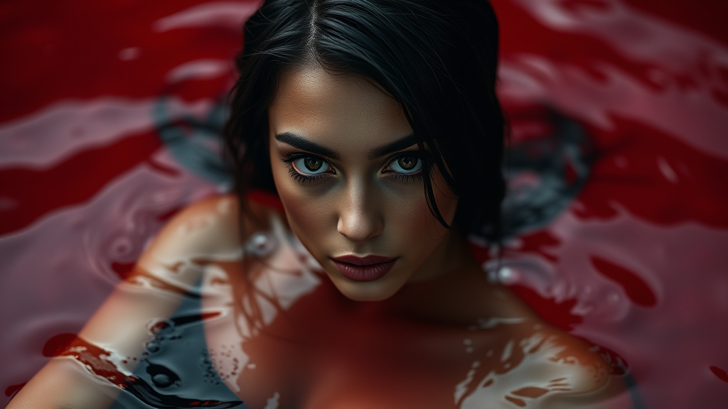 Fashion editorial portrait of a striking young dark-haired woman immersed in deep crimson water; her hair and skin glistening, captivating eyes with an enigmatic allure; ultra high-resolution, lifelike aesthetics, expert photographic quality, cinematic perspective, dramatic backlighting illuminating her form.