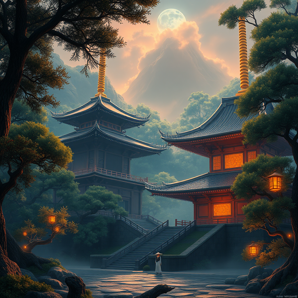 Japan-inspired landscape featuring two ancient temples by Laurie Greasley, surrounded by lush trees, illuminated by enchanting fantasy lighting. The scene is intricately detailed, capturing the essence of traditional Japanese architecture with a touch of magical ambiance, in a composition reminiscent of a painting on Artstation with an aspect ratio of 2:1.