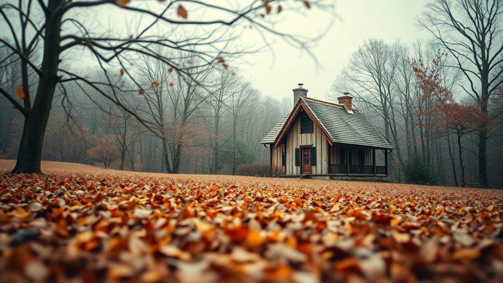 High quality, ultra-detailed CG 8k wallpaper of a serene landscape featuring a quaint house nestled among a carpet of leaves in muted winter tones, capturing the essence of award-winning photography. The scene is enhanced with a stunning bokeh effect, a rich depth of field, and vivid HDR, complemented by a soft bloom and subtle chromatic aberration. This photorealistic depiction showcases intricate textures and exquisite detail, inviting viewers into a tranquil, picturesque setting.