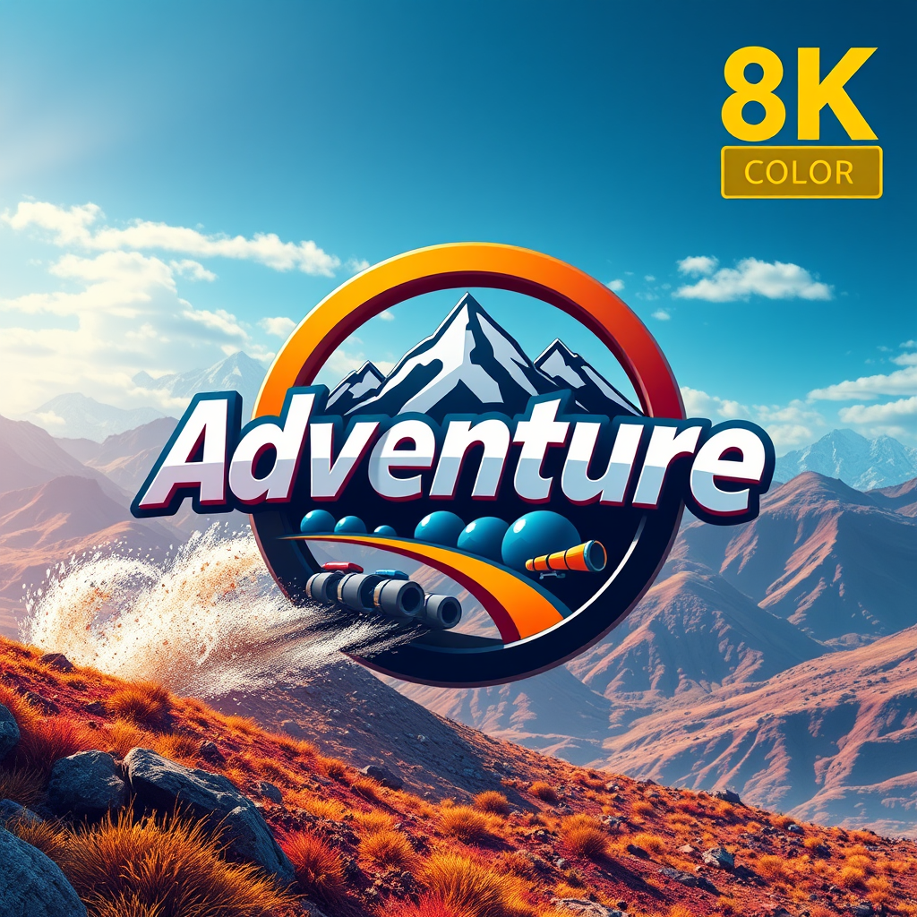 Adventure-inspired logo icon with a 3D fusca in a dynamic setting, showcasing high-detail realistic graphic design. The scene features a vibrant and colorful landscape, capturing the essence of exploration and motion, rendered in high-resolution 8k, embodying the spirit of a journey with vivid RAW color art.