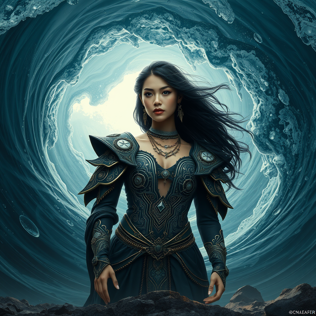 A breathtaking woman, the sovereign of the ocean, emerges with grace from within a spiral wave of water, set against a magnificent backdrop. Her exquisitely detailed and realistic visage framed by intricate clothing that fuses elements of a circuit board with elaborate fantasy tribal designs. She stands confidently on ground, embodying the epitome of dark fantasy allure. This scene, masterfully illustrated, evokes the immersive quality of an 8k resolution cinematic render, with ultra-detailed 3D Octane textures. The photorealistic concept art draws the viewer in with sharp focus, an impeccable composition, and dynamic interplay of intense shadows and lighting, suitable for a wallpaper in HDR, capturing high-definition beauty and complexity throughout.