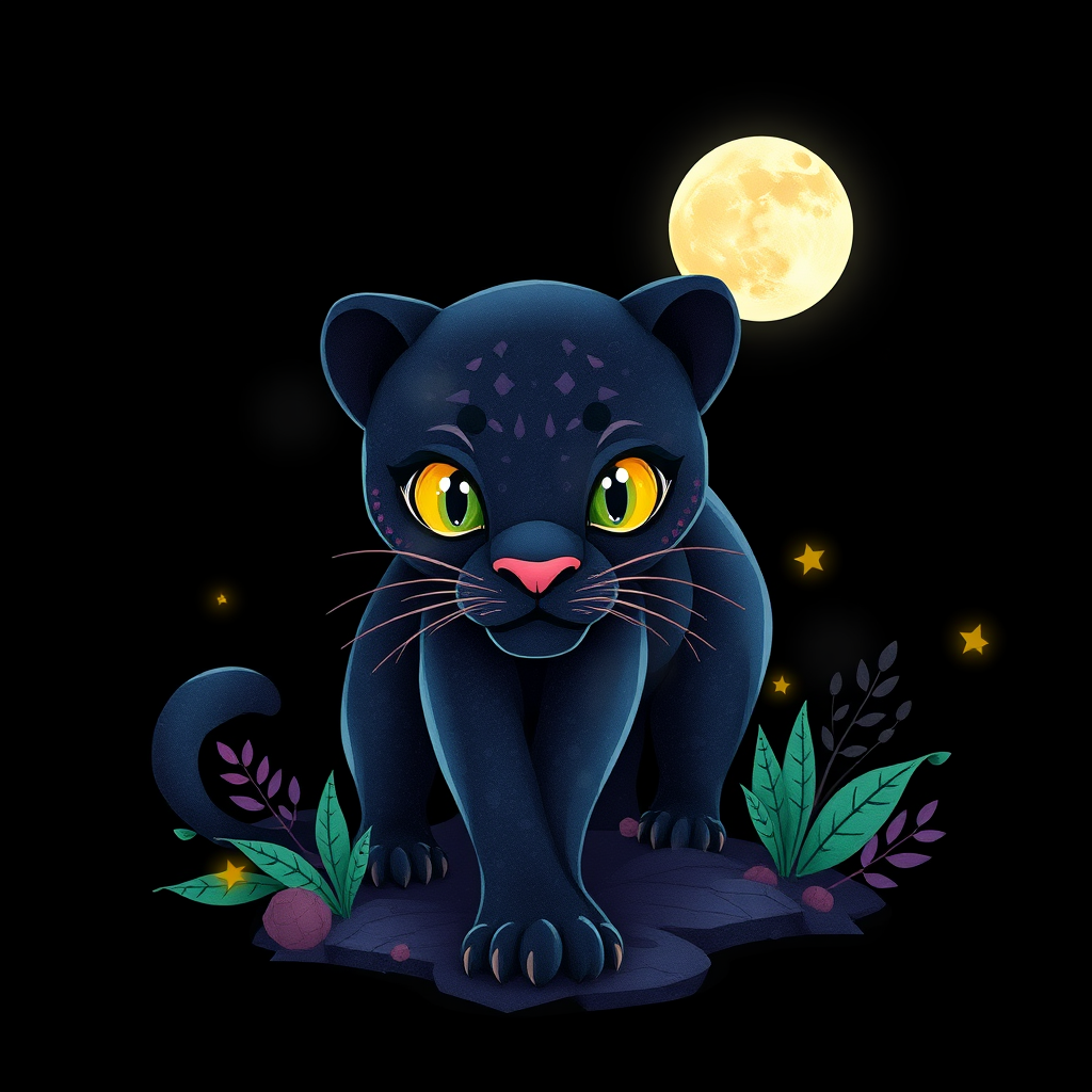 Silhouette design of a black panther under moonlight, featuring t-shirt art in 3D vector style. The panther is depicted as cute and quirky with bright, bold colors against a black background, incorporating a watercolor effect in digital painting. The design includes low-poly elements with soft lighting from a bird's-eye view in isometric style, embracing a retro aesthetic focused on the panther character. Rendered in 4K resolution with photorealistic quality using Cinema 4D, showing the front side, creatively integrating elements like glowing stars and abstract jungle motifs to enhance visual interest.