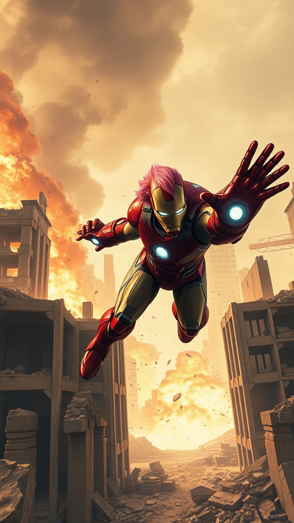 RAW image of Ironman, captured in mid-air amidst an intense and explosive scene, exuding a sense of dynamic action and imminent danger; the backdrop showcases city ruins. Photographed in 8k UHD with a DSLR, the shot features soft lighting and high quality, with a subtle film grain texture, reminiscent of a Fujifilm XT3 illustration. The image combines 3D elements and a sepia-toned painting style, blending characteristics of cartoons and sketches. Additionally, it experiments with unique features such as unusual anatomy, whimsical details, and vibrant pink hair, providing an analog photography feel, while playing with abstract elements like multiple eyebrows and intriguing out-of-frame effects.