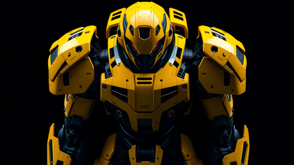 A formidable black and yellow battle mech with intricate, sci-fi elements, showcasing a stunningly detailed mask and a sleek material that reflects light off its vibrant yellow body. The mech is equipped with a sophisticated jetpack, crafted with precision and boasts insectoid-inspired features that enhance its combat capabilities. Its armor, made of bright yellow polymer, is accented with unique identifying marks and natural textures that lend a realistic, lifelike quality. The mech's exposed innards are intricately detailed, adding depth and a sense of mechanical realism. Set against a black background, the scene captures an eerie and dramatic aura, illuminated by Rembrandt lighting. The composition is taken from a top-down perspective with cinematic shooting, producing an ultra-high-resolution and photorealistic image in 8K UHD, showcasing hyper-realistic shading and stunning quality. This visual spectacle avoids the pitfalls of cluttered elements or poor proportions, maintaining an aesthetic that is both lifelike and meticulously crafted.